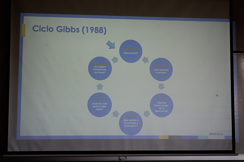 En la misma línea la académica dio a conocer distintos modelos reflexivos como, por ejemplo: El modelo de Gibbs, una herramienta que ayuda a aprender de las experiencias pasadas. Del mismo modo, los indicadores del proceso de reflexión, guía práctica para promover y evaluar la reflexión, y estructura de ensayos reflexivos.